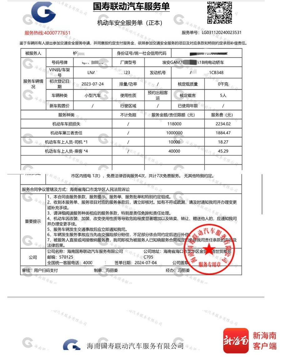 海南国寿联动汽车服务有限公司与消费者签订的不是保险合同,而是《机动车安全服务单》。受访者供图