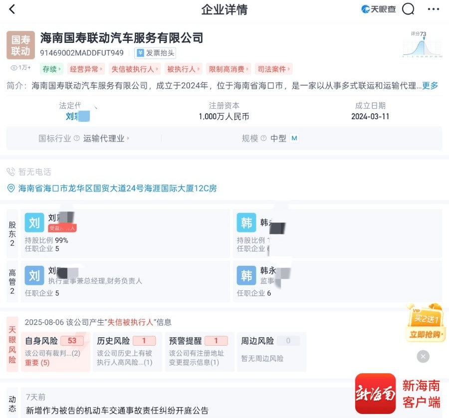 公开信息显示,海南国寿联动汽车服务有限公司存在经营异常、失信被执行人、限制高消费等情况。