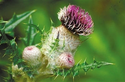 被稠密而膨松的棉毛包裹着,紫色的花蕊隐在其间,像一位贵妇,傲然挺立在高海拔地区这是贡山蓟给人的第一印象。仔细观察,你会发现它浑身是刺,就连宽扁的叶柄边缘也都有刺齿或针刺。物竞天择,适者生存,要想在残酷的大自然中不被淘汰,就得有自己的“杀手锏”,这些让人难以靠近的刺就是它的保护伞,用来抵御动物的嚼食。