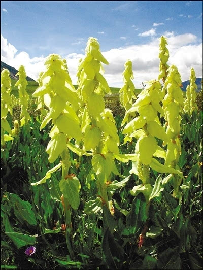 每年6、7月分,在喜马拉雅山麓的高山石滩及湿草地都能看到一种淡黄色的植物,高达2米,根状茎长而粗壮,这就是塔黄。在一大片植物中它显得格外特别,因从远处看像一座座小塔而得名。走近看,它的根部生出很多宽大的叶片。在藏医理论中,它是治疗便秘、食积痞滞、痢疾、腹痛、湿热等疾病的良药。