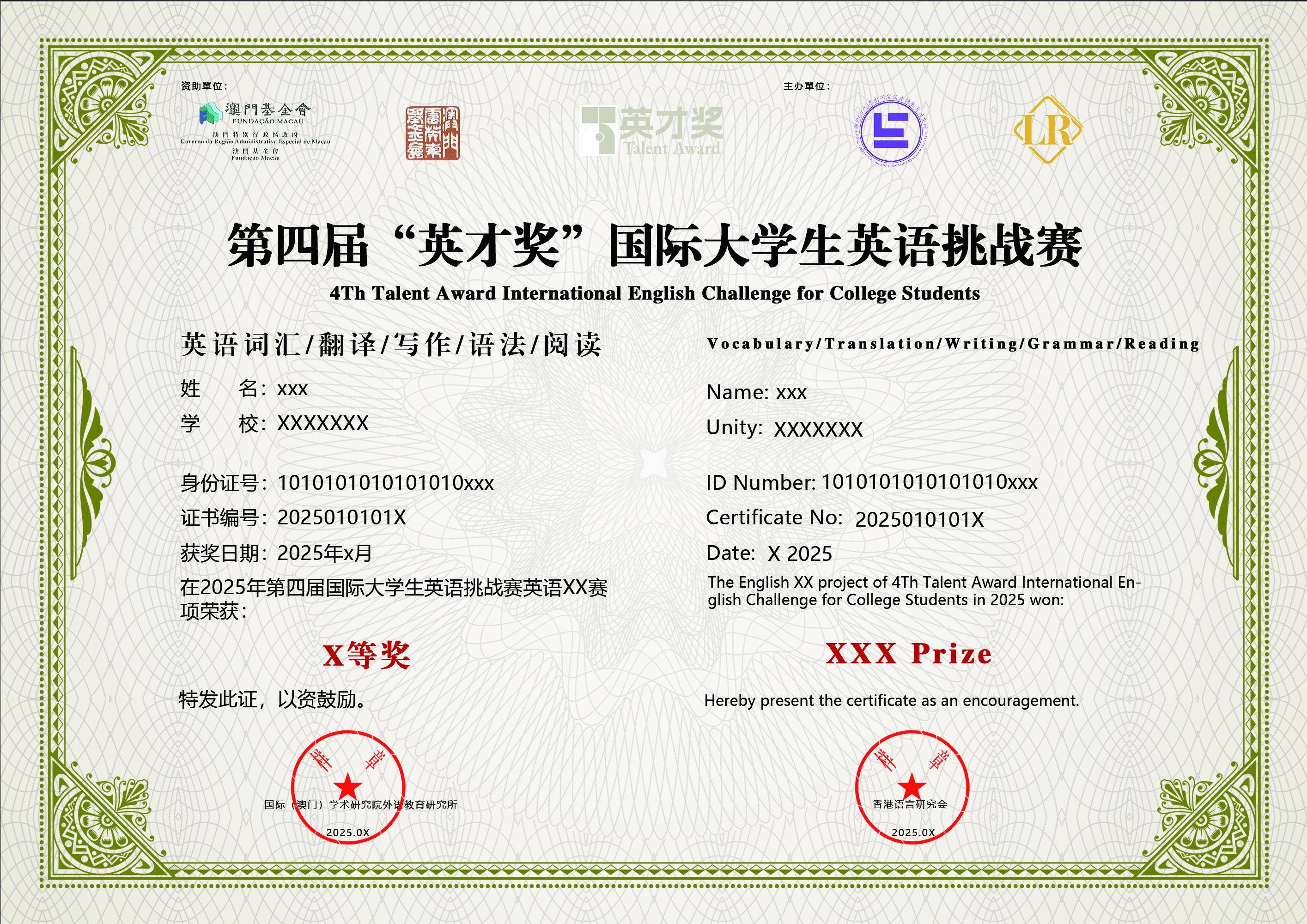 本次挑战赛由国际(澳门)学术研究院外语教育研究所、香港语言研究会主办,汇聚了来自全球各地的优秀大学生。本届赛事统一为线上参赛。大赛考察范围为四、六级词汇;专业英语六、八级词汇,不仅考验选手的词汇量,更注重词汇在实际语境中的应用能力。参赛者在大赛截止前,可自行选择时段,随报随考,完成考试提交答卷后考试成绩既出,最终截止时间为2025年6月30日。