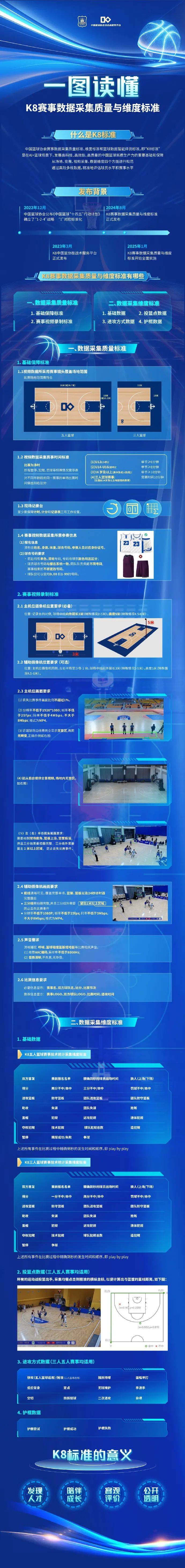 “K8标准”指中国篮球协会赛事数据采集质量标准、维度标准和篮球数据智能评测标准,是一套通过高阶多维数据精准评估球员水平和赛事水平、不断优化的比赛数据采集维度和计算标准矩阵。