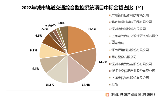 2022年,共有13家通信厂商分食综合监控系统市场,竞争格局分散。其中,广州新科佳都科技有限公司登顶中标企业榜首,中标总金额达138205.92万元,占据全年中标总金额的21.1%;其次是北京和利时系统工程有限公司,中标总金额达96296.32万元,占比14.7%;排名第三的是深圳达智能股份有限公司,中标总金额达94015.09万元,占比14.4%。