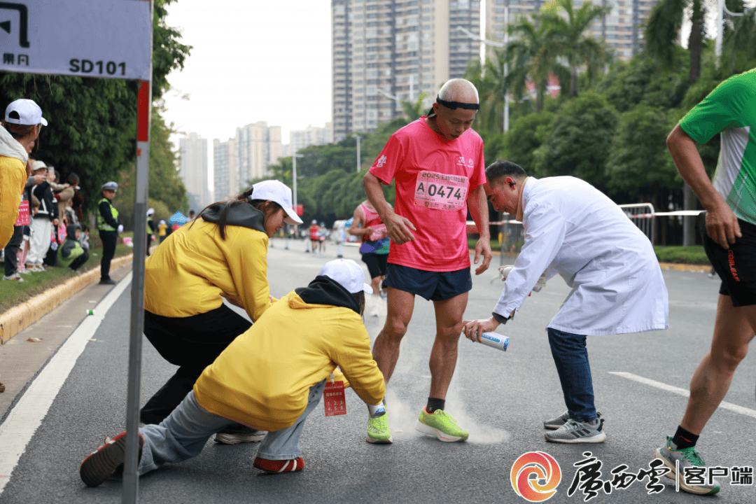 玉林市青年志愿者与医务志愿者为马拉松大赛参赛选手提供服务。玉林市委社会工作部 供图