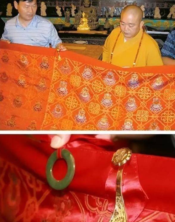 释永信穿着打扮跟一般和尚差远了。他披的那件袈裟是用金丝银线绣的,六个绣娘花三个月做成,值16万,上面还镶翡翠玉环。