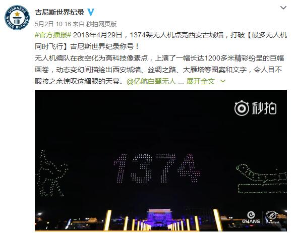 在5月1日的正式表演之前,这个来自亿航白鹭的无人机编队就已经进行过两次成功的彩排,吉尼斯世界纪录官方微博还确认29号的预演中1374架的数量打破了世界纪录。据介绍编队有1374架无人机,因为西安明城墙的周长为13.74千米。