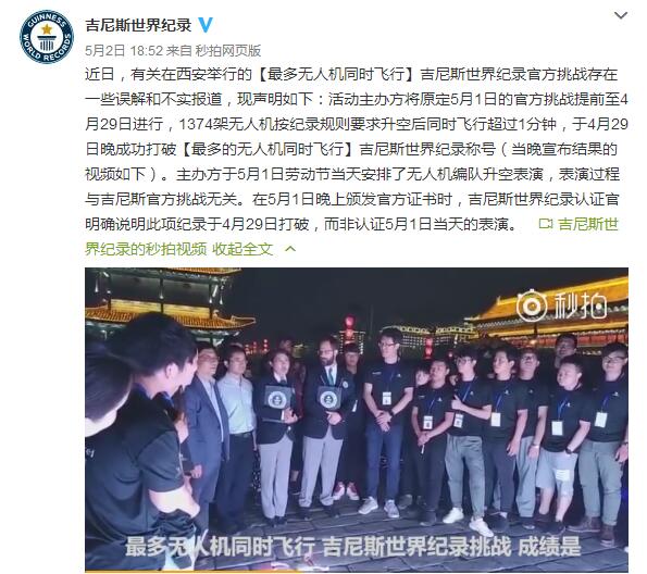 遇到公关危机的还有吉尼斯官方,有网友质疑为何表演出现失误还成功破纪录?5月2日吉尼斯世界纪录官方微博又发出了声明。声明称吉尼斯世界纪录认证官明确说明此项纪录于4月29日打破,而非认证5月1日当天的表演。