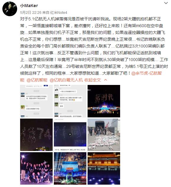 当事方怎么说呢?有报道称该企业也正在排查是演出失误是由人为操作造成,还是受信号干扰的因素,待排查清楚后,会给公众通报。环球网无人机频道第一时间也联系了亿航相关工作人员,对方表示稍后会对公众做出事件声明,我们也还没得到提前消息。看来新闻还需要飞一会儿,环球网无人机频道将继续关注。