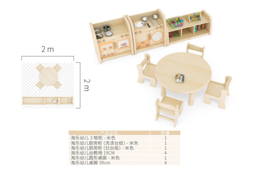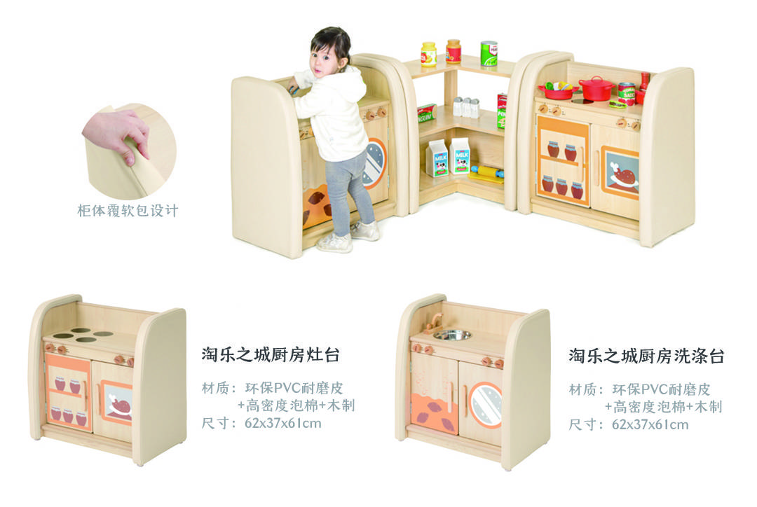 厨房组以米色为主色,辅一美食卡通图案,为幼儿厨房扮演增添氛围感。同时该区域还配置厨房灶台、厨房洗涤台、3格柜、幼教桌椅等设备,让幼儿在仿真厨房里,真实体验做家务。